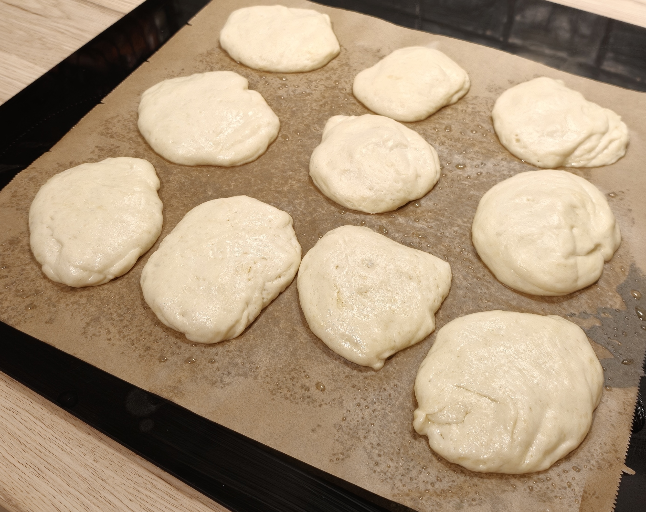 Form between 8 an 16 buns of dough and spread them on the baking paper.