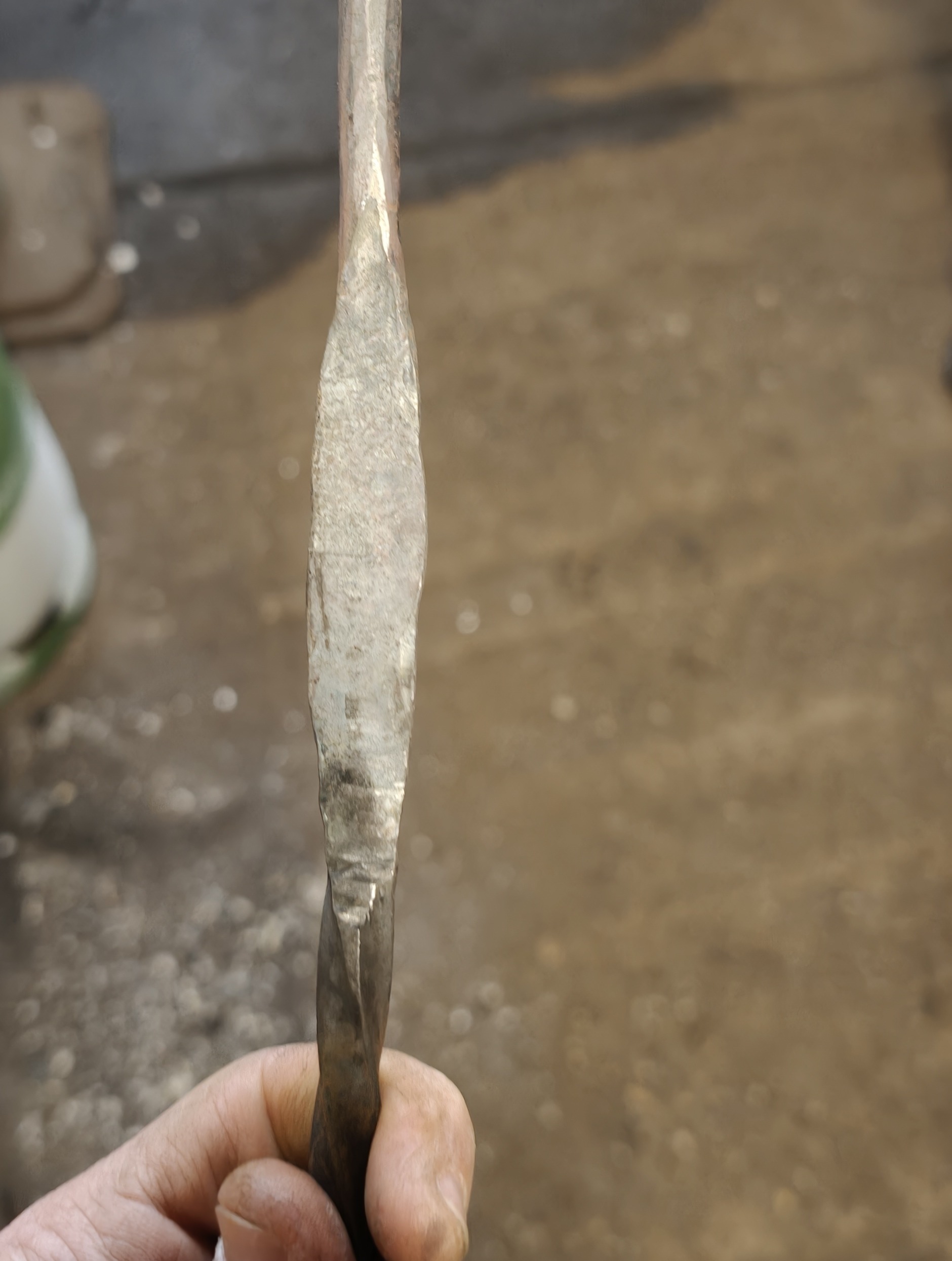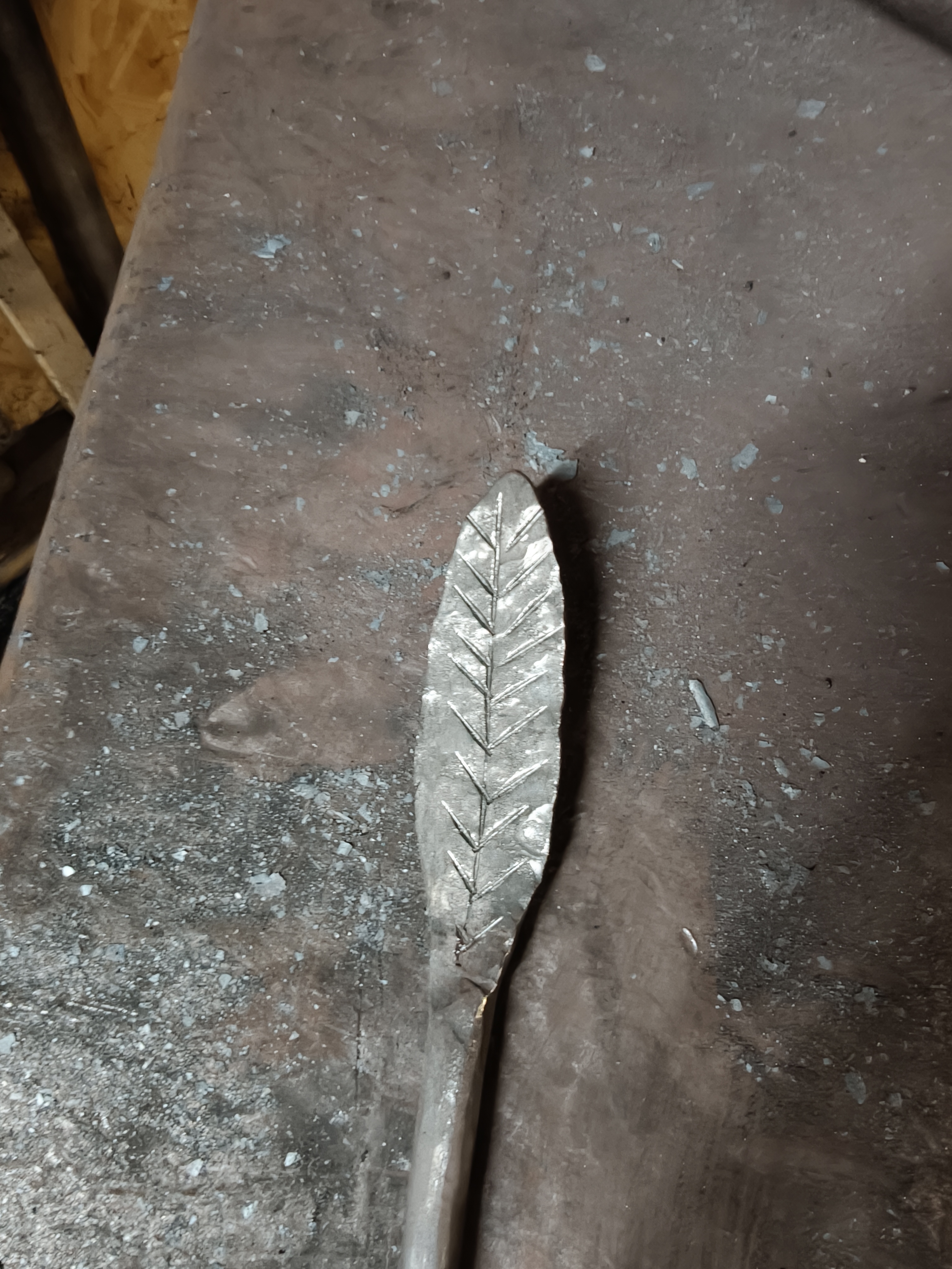 I held the rod in one hand, and a big hammer in my right hand. The master held the chisel pointed at the middle of the leaf-shaped end. My job was to whack the chisel hard enough to make lines in the cold steel.