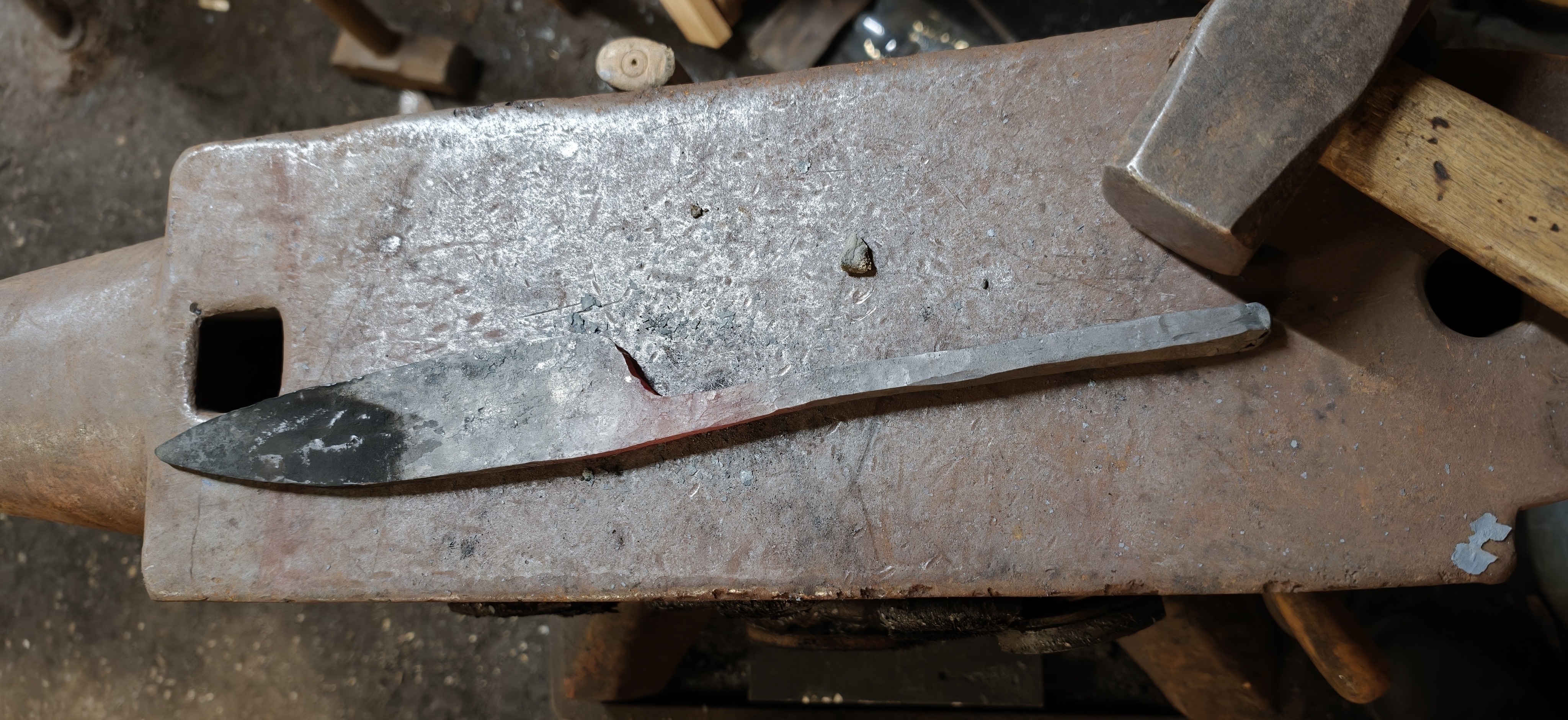 So back to the hammer I went. Firstly, I used the big 2kg one to get the thickness back to where it was and unwarp it. I then took the smaller hammer and continued working on the bevels and the transition from the blade into the rod that would become the handle.